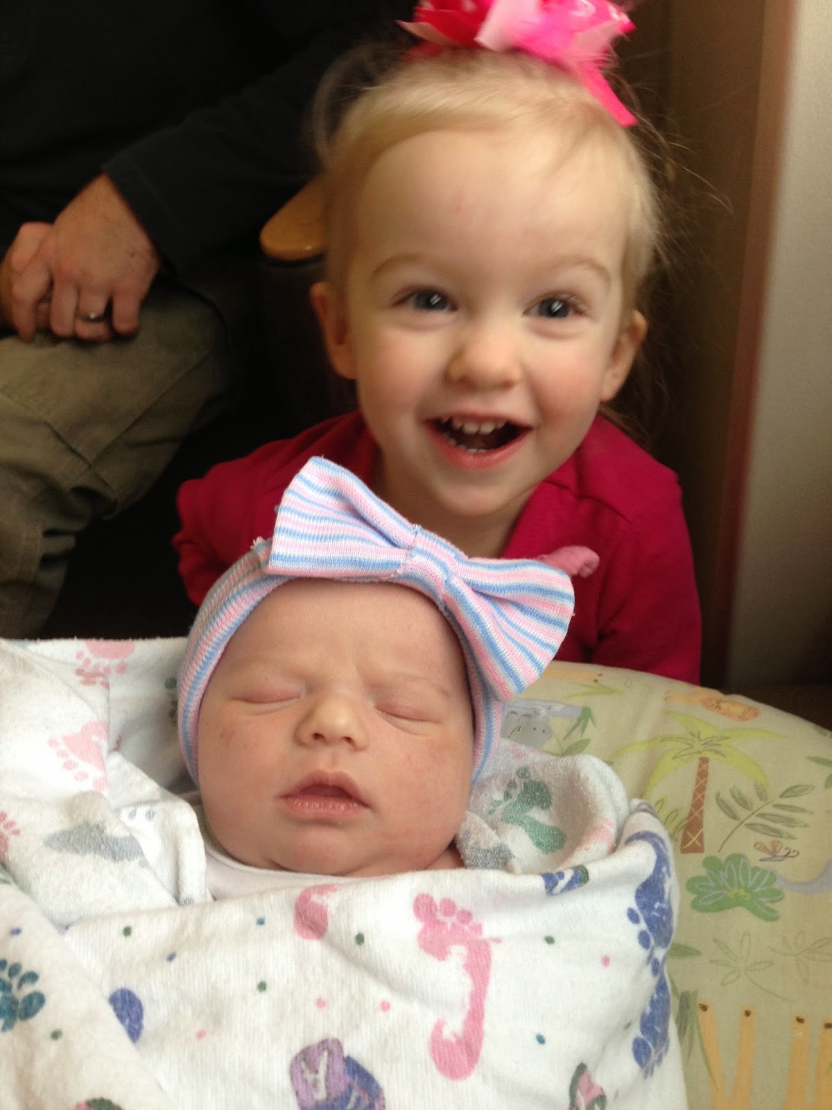 Three hours after her birth, her big sister Amelia awoke to find that her parents had disappeared in the night. She was feeling a bit sad about that until I told her I'd show her a picture. When she saw the picture her dad sent from the hospital she was like a kid at Christmas...so excited to see that the long awaited sister had appeared.